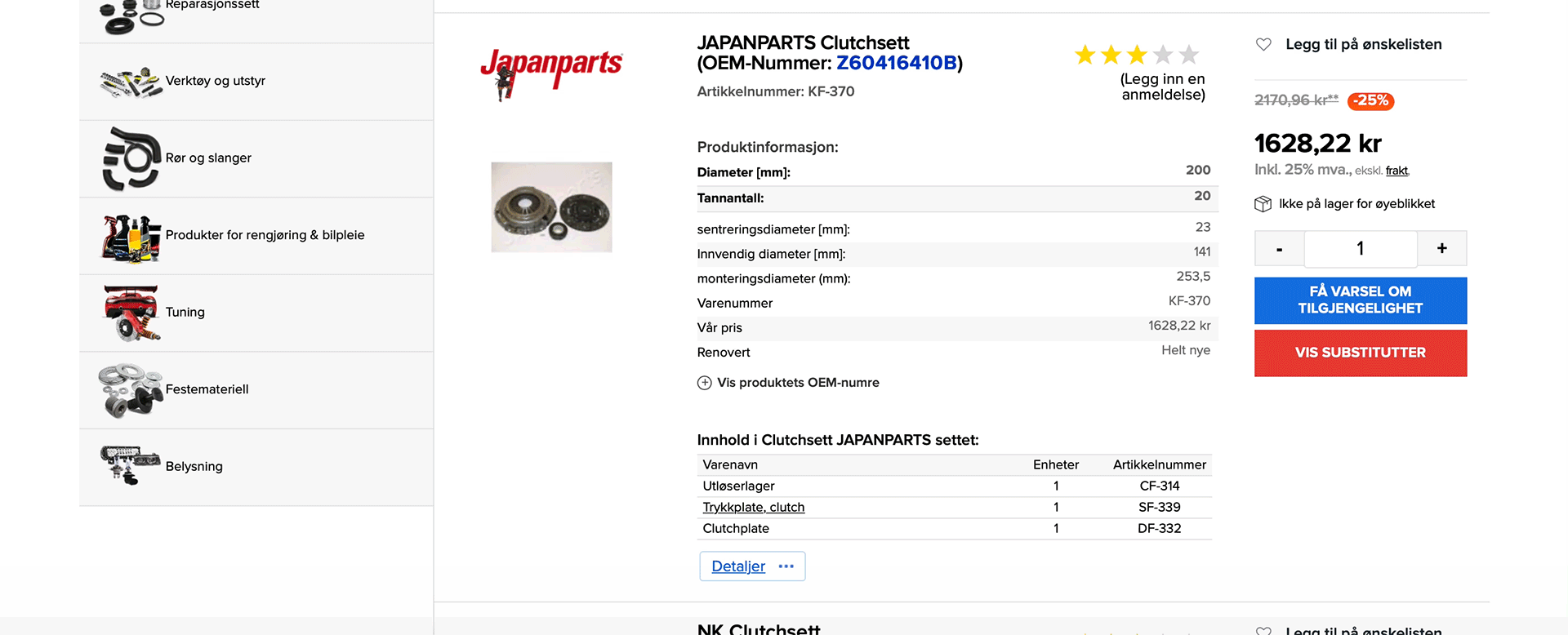 En lista över alternativ visas när du söker efter delar med hjälp av deras OEM-nummer. Ett alternativ är en produkt som har liknande eller identiska egenskaper. Direkt efter att du angett OEM-numret bör du se till att jämföra egenskaperna hos alternativen som visas i listan. Om det finns ett antal sökresultat du måste välja mellan bör du läsa och noga jämföra egenskaperna hos de alternativa produkterna med din originalprodukt eller kontakta vår kundtjänst för att få hjälp. Om reservdelen du behöver är slut i lager använder du knappen "Vis substitutter". Du kommer att få se en lista över produkter med liknande eller identiska egenskaper, men de kan vara av andra märken eller ha olika priskategorier.